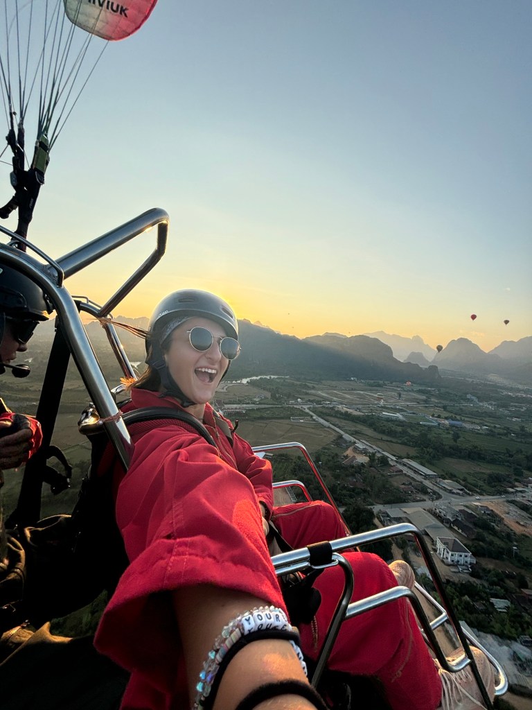 If you’re looking for a flying experience that’s both unique and unforgettable, you have to try paramotoring! I had the chance to do this in Vang Vieng, Laos, and it was nothing short of incredible. Paramotoring combines the thrill of paragliding with the added control of a motorized system. Essentially, it involves a seat and motor attached to a parachute, allowing for a smoother, more guided flight.