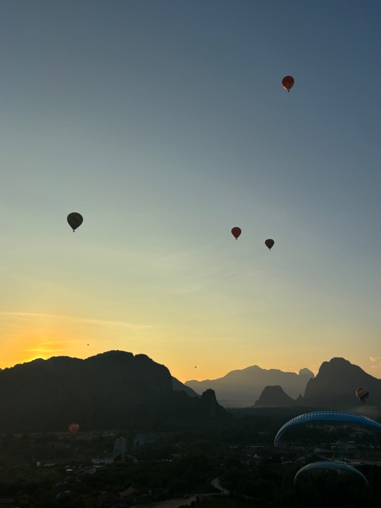 The views in Vang Vieng are nothing short of spectacular. The lush landscape is dotted with towering mountain peaks, endless rice fields, and dense greenery that stretches as far as the eye can see. Paramotoring offers a panoramic vantage point that’s hard to beat. As you glide through the air, you’ll also see vibrant hot air balloons drifting nearby, adding a magical touch to the already stunning scenery.