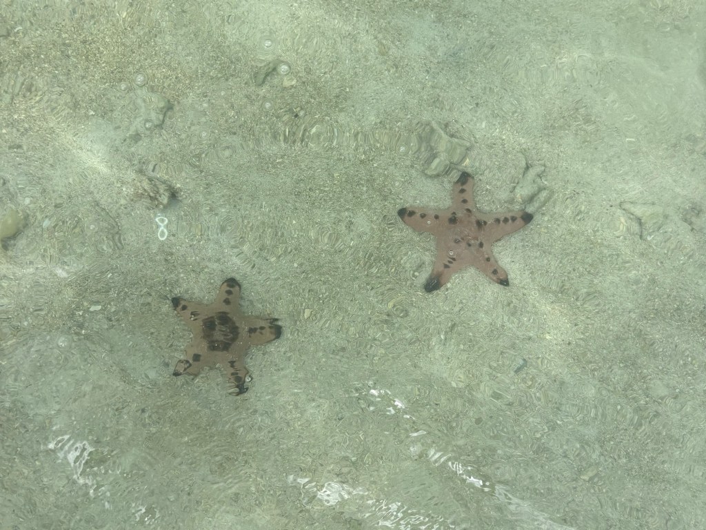 Our tour took us to several pristine snorkeling spots, where we swam alongside vibrant coral reefs, spotted tropical fish, and even had the chance to see sea turtles up close. We also stopped at a stunning sandbar in the middle of the ocean, where starfish dotted the shallow waters, creating an almost surreal landscape. Another highlight was visiting a remote island, where our boat crew prepared an incredible lunch of freshly grilled seafood, vegetables, and tropical fruits, all beautifully arranged and cut in ways I’ve never seen before. The day ended with some local rum and coke provided by the staff, making for a fun and social experience with both fellow travelers and the friendly locals who ran the tour. If you have a free day in Port Barton, I highly recommend booking an island-hopping trip—it’s an unforgettable way to see the area’s raw beauty, and tap into your snorkeling side.