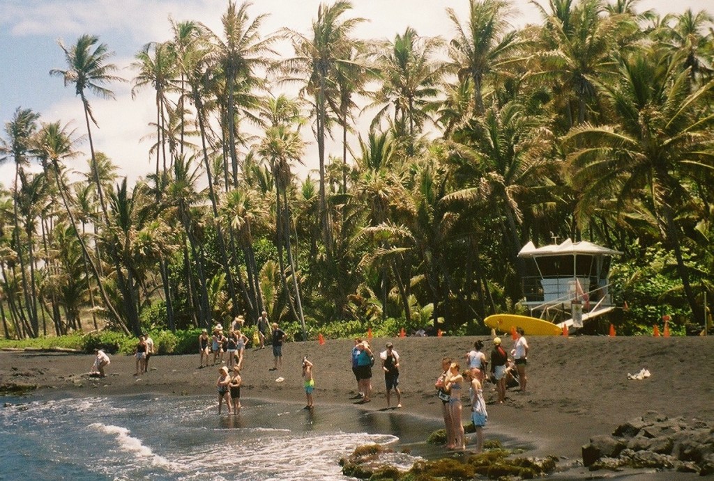 Punaluʻu Black Sand Beach – One of the most famous black sand beaches in the world, Punaluʻu is a must-visit for its jet-black shoreline, swaying palm trees, and frequent Hawaiian green sea turtle sightings.