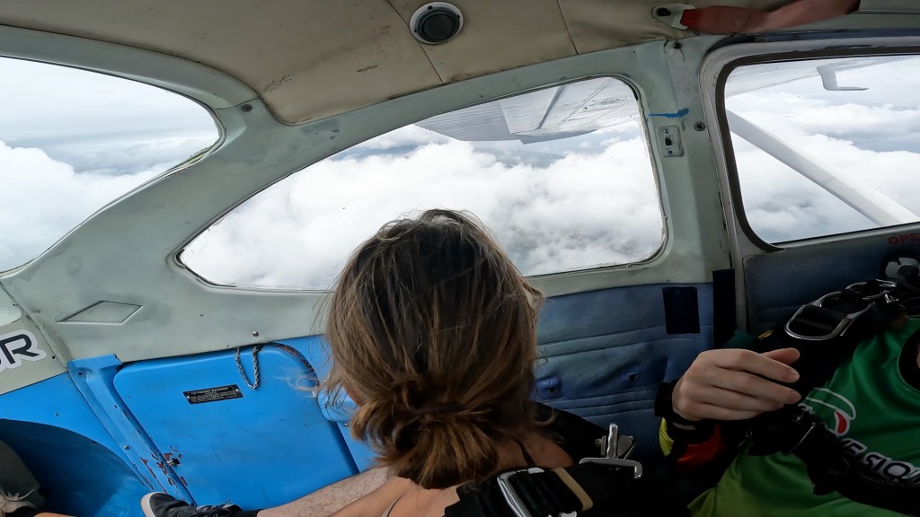 If you’ve skydived before, you might be used to bigger planes with bench seating, but this plane is tiny—which makes it feel even more intense. You’ll be sitting (or more like lying down) super close to your instructor and any other divers on board. It’s a snug fit, but honestly, that just adds to the experience.