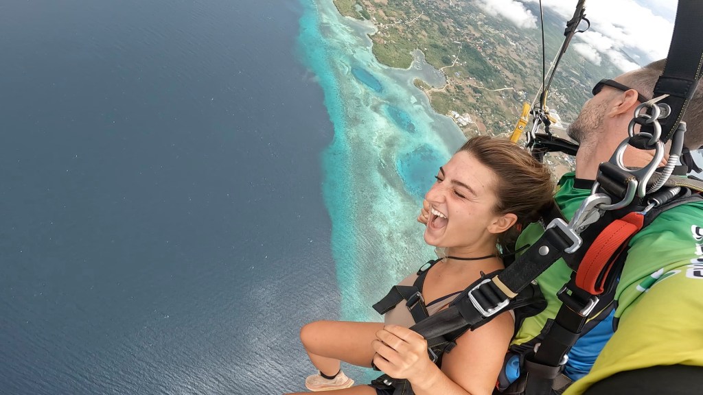 When I jumped, it was actually super cloudy, which made it even more surreal. We fell straight into a thick layer of clouds, and for a few seconds, it felt like we were just falling into nothingness. Then, we broke through the clouds, and the island came into view beneath us—lush greens, deep blues, and every shade of turquoise imaginable. That moment alone made the entire experience worth it.