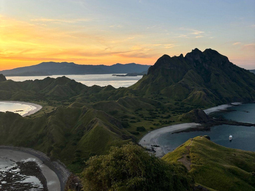 As the day cooled down, we headed back to the boat and we sailed to Padar Island, famous for its dramatic hills and a surreal viewpoint. The hike was short but steep, and the reward was one of the most iconic landscapes in Indonesia: three crescent-shaped beaches stretching out in different directions. The mountains are so lush and full of so much greenery, and the views are truly unforgettable. We sat in silence as the sun sank into the sea and turned the sky the most beautiful colors. The stars and the moon came out adding to this surreal experience. As we hiked down we even spotted a wild deer on the beach before heading back to the boat for the night.