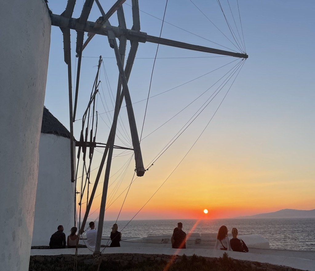 The windmills of Mykonos are one of the most iconic spots on the island. They represent the history and heritage of both Mykonos and Greece, but they also happen to be one of the best places to watch the sunset. From the hill where the windmills sit, you get wide views of the sea and the town below. You can walk around and find a good spot to sit and watch the sun go down. The sunsets over the Mediterranean don’t disappoint. The sea glows with golden and pink tones as the sun reaches the horizon, and the white buildings across the island reflect that same warm light. It’s a calm, beautiful place to end the day and one of the best sunset spots in Mykonos.