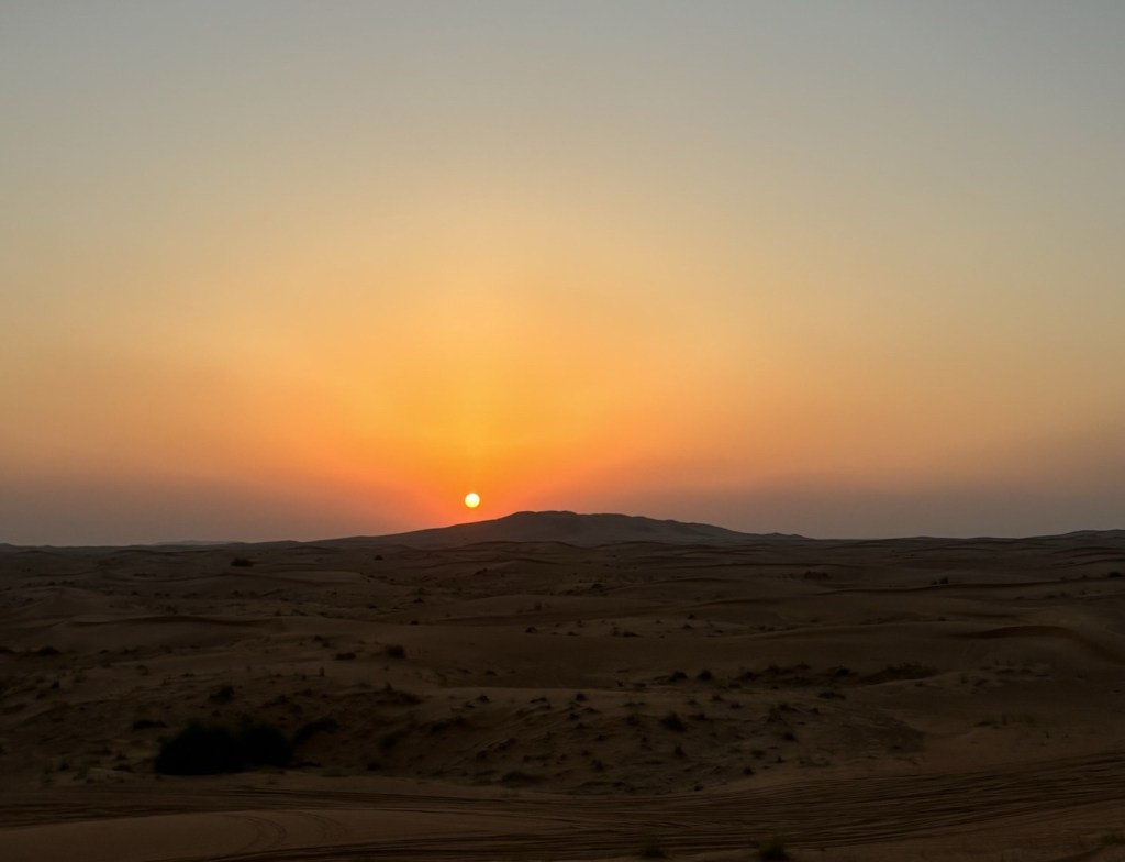 The Rub’ al Khali, part of the larger Arabian Desert that surrounds Dubai, is a popular escape from the city and one of the best places to catch a desert sunset. It’s known for its deep red sand dunes, and as the sun goes down, the colors of the sand shift into rich red and golden tones. It’s simple but stunning. Sunsets in the Arabian Desert feel different from anywhere else. Whether you’re watching from the back of a 4×4, riding a camel, or sandboarding down a dune, you get a wide open view with no buildings or crowds in the way. It’s peaceful, quiet, and a total contrast to the busy city nearby.
