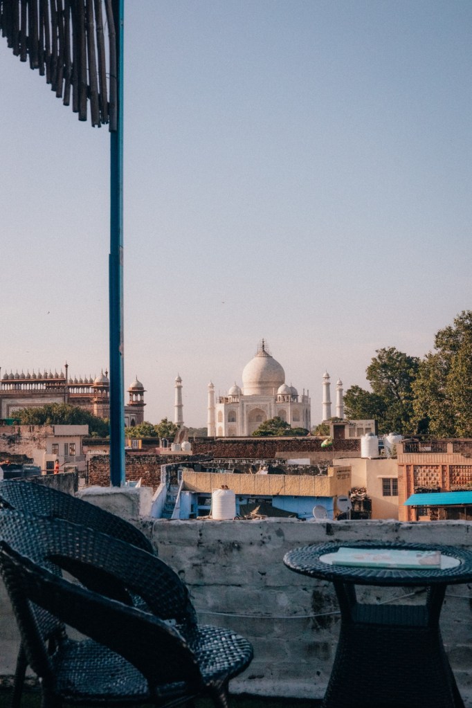 Next is Agra. I highly recommend Joey’s Hostel, which is also part of a well-known chain in India. It’s an excellent choice in Agra, especially because it has one of the best rooftop views of the Taj Mahal. From the rooftop, you can enjoy breakfast, lunch, dinner, or drinks, and they even have a free chai hour. The views are absolutely incredible, and the location is super convenient. It’s about a five-minute walk to the East Gate of the Taj Mahal, which is perfect if you want to catch sunrise. The hostel itself is clean, friendly, and well-run. You can choose between private rooms or dorms, and everything you need is provided for a comfortable stay.